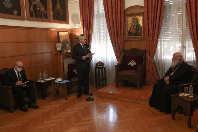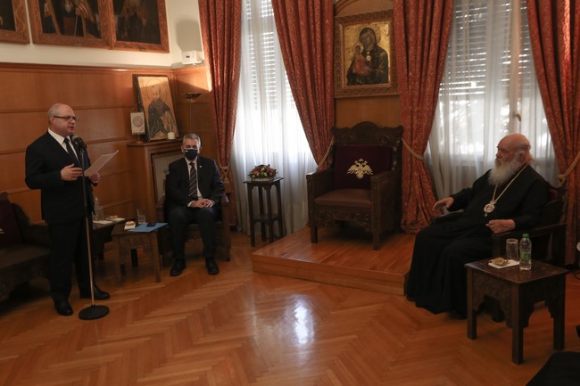 Ο Γενικός Γραμματέας της Δ.Σ.Ο. Βουλευτής Μάξιμος Χαρακόπουλος, στην προσφώνησή του ευχαρίστησε τον Αρχιεπίσκοπο που, όπως είπε, «για μια ακόμη φορά είναι ανοικτές οι θύρες της Αρχιεπισκοπής για να σας ενημερώσουμε για τις δράσεις και το σχεδιασμό της Διακοινοβουλευτικής Συνέλευσης Ορθοδοξίας». Απευθυνόμενος προς τον Μακαριώτατο επεσήμανε ότι «στο πρόσωπό σας συναντούμε τη νηφαλιότητα της ορθόδοξης προσέγγισης σε κάθε δοκιμασία, αλλά και έναν ειλικρινή συμπαραστάτη των προσπαθειών μας για καταλλαγή, αλληλοκατανόηση και αλληλεγγύη των λαών». Αναφέρθηκε, επίσης, στην πανδημία που ταλαιπωρεί όλο τον κόσμο τονίζοντας πως βρισκόμαστε σε μια αισιόδοξη καμπή της μεγάλης δοκιμασίας που μας ταλαιπωρεί για τόσους μήνες και σημείωσε ότι όλο αυτό το διάστημα αναμφίβολα οι συνήθειές μας, οι κοινωνικές μας επαφές, οι εκδηλώσεις μας ετέθησαν υπό αναγκαστικό περιορισμό στο όνομα της υγείας. Επαίνεσε, ακόμη, την Εκκλησία της Ελλάδος, η ιεραρχία της οποίας συνετέλεσε σε σημαντικό βαθμό, ώστε να τηρηθούν τα προβλεπόμενα μέτρα, προσαρμόζοντας ανάλογα και τις λειτουργικές ανάγκες. «Με τις αποφάσεις που λάβατε και τα λόγια νουθεσίας μειώθηκαν δραστικά οι επιδράσεις από τις φωνές εκείνες των κάθε φύσεως και προελεύσεως αρνητών, οι οποίες παραπλανούσαν και επέφεραν ταχύτερη διάδοση της ασθένειας. Άλλωστε και η ίδια η Εκκλησία θρήνησε θύματα μεταξύ των ιερωμένων όλων των βαθμίδων» συμπλήρωσε ο κ. Χαρακόπουλος και προσέθεσε ότι «με αυτή την δοκιμασία έγινε πιστεύω ακόμη πιο διακριτή η σχέση επιστήμης και θρησκείας, όπου δεν πρέπει να γίνονται συγχύσεις και προσπάθεια αλληλοκατάργησης. Δυστυχώς, όμως, όλοι είδαμε ότι παρόλο που ο πλανήτης έδινε αυτή τη μάχη ζωής και θανάτου, δεν έλειψαν οι αντιπαραθέσεις ακόμη και οι πόλεμοι». Ο κ. Χαρακόπουλος ανέφερε τους στόχους της Συνέλευσης και υπογράμμισε: «Μακαριώτατε, είμαι βέβαιος ότι θα σας βρούμε συμπαραστάτη γιατί γνωρίζουμε ότι συμμερίζεστε τις ανησυχίες μας».
