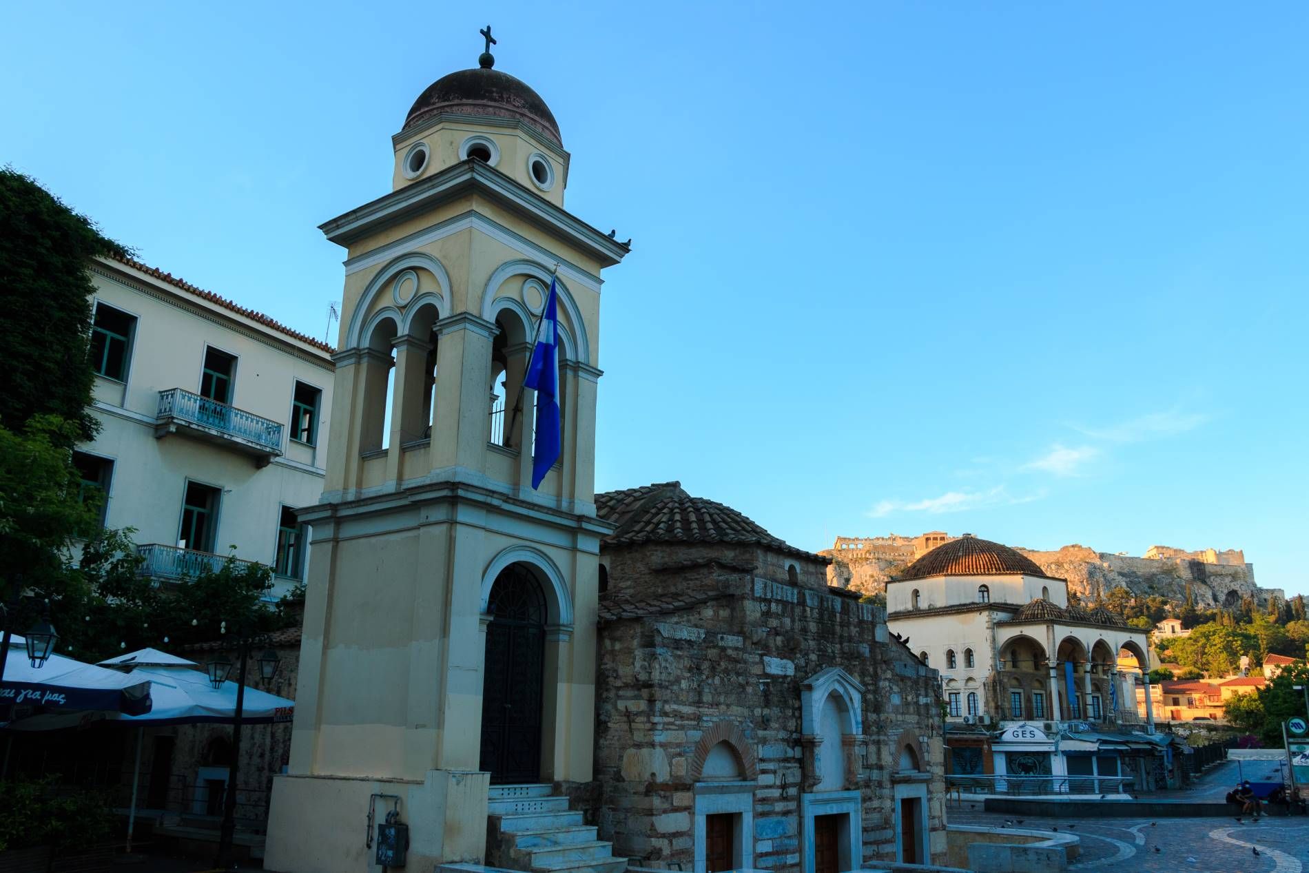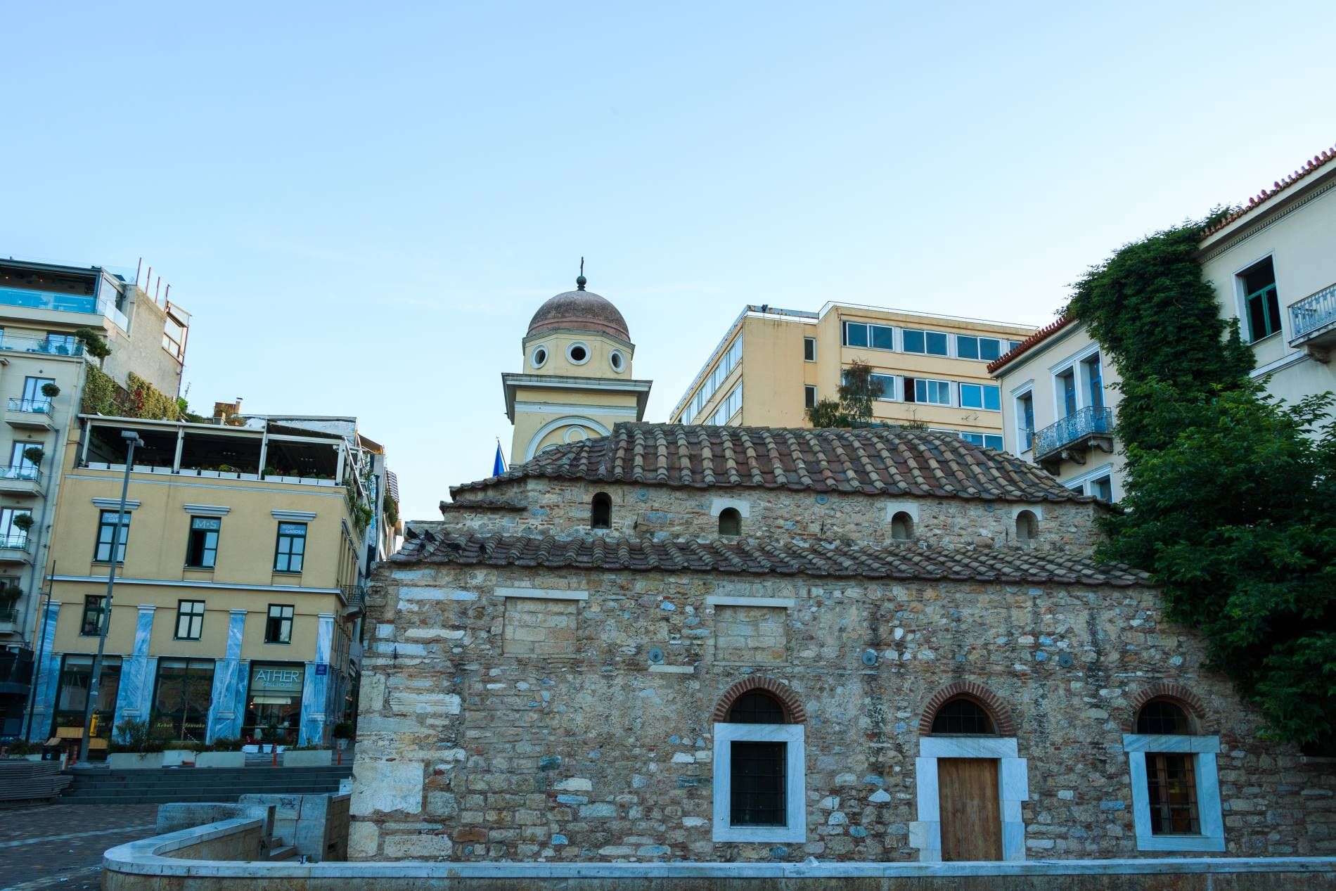 Αρχικά η εκκλησία της Παντάνασσας (=της Βασίλισσας των πάντων) Θεοτόκου, που είναι αφιερωμένη στην Κοίμηση (15 Αυγούστου), ήταν ιδιόκτητος ναός του Νικολάου Μπονεφατζή, και αργότερα έγινε Καθολικό γυναικείου μοναστηρίου, που τα κτίσματα του κάλυπταν το σύνολο της πλατείας, γι’ αυτό και λεγόταν και «Μέγα Μοναστήριον». Σιγά-σιγά όμως άρχισε να φθίνει, ώστε αρχικά να καταντήσει Μετόχι της Μονής Καισαριανής και αργότερα (ίσως από το 1690) ενοριακός ναός και έκτοτε, οπωσδήποτε από το 1821, να λέγεται «Μοναστηράκι».